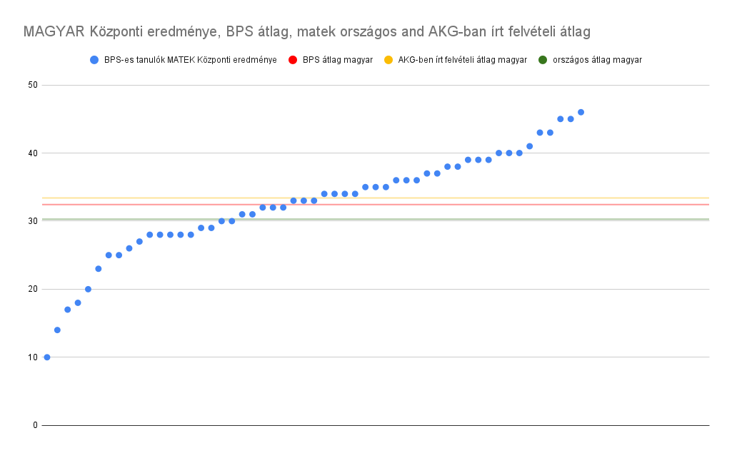 Tavaly a BPS-es átlag mindkét tantárgyból gyakorlatilag megegyezett az AKG-ben írók átlagával: 33,7 magyarból és 30,0 matekból is. Ehhez képest idén 1,27 ponttal alacsonyabb magyarból és 1,8 ponttal matekból.